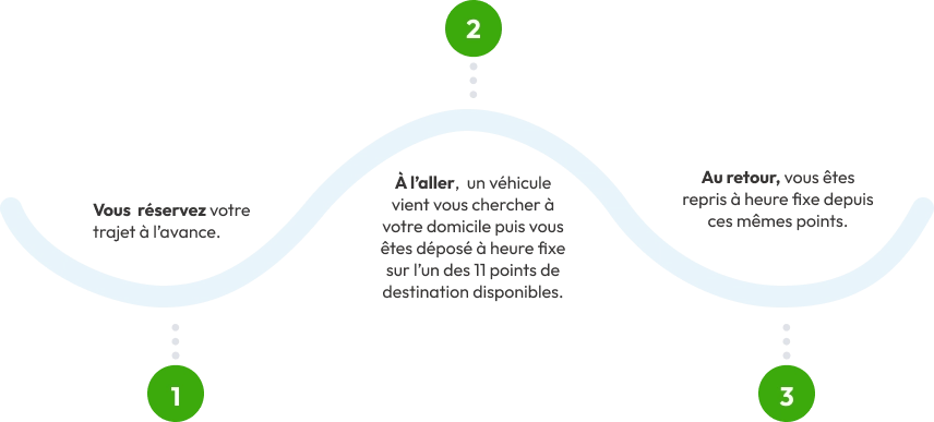 - 2À l’aller, un véhicule vient vous chercher à votre domicile puis vous êtes déposé à heure fixe sur l’un des 11 points de destination disponibles.